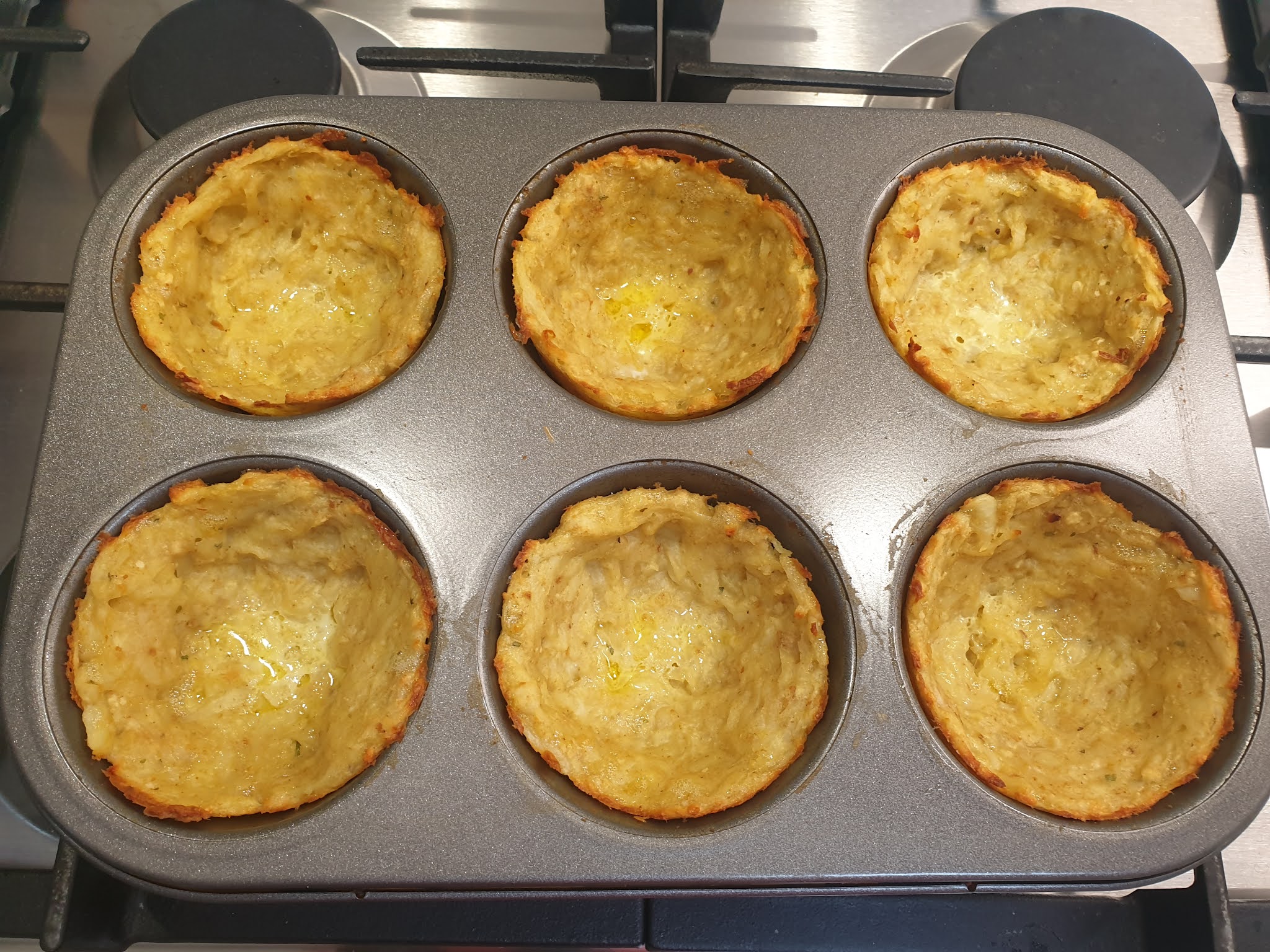 2. Formele de brioșe se ung cu unt sau ulei, se adaugă cîte o lingură mare din compoziția de cartofi, se formează coșulețele (se primesc 12 bucăți mici sau 9 buc mari cum am eu forma), se coc la 180 Gr timp de 20 min;